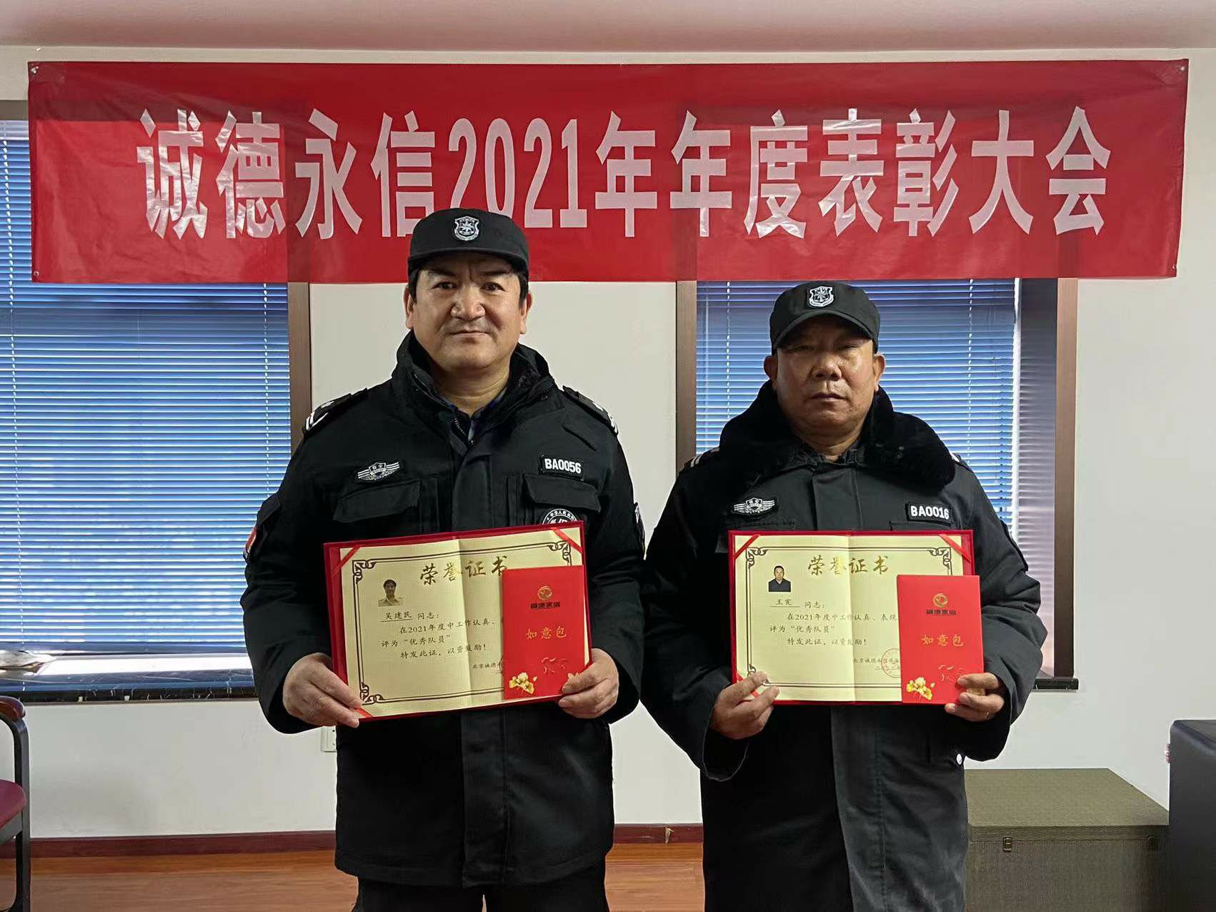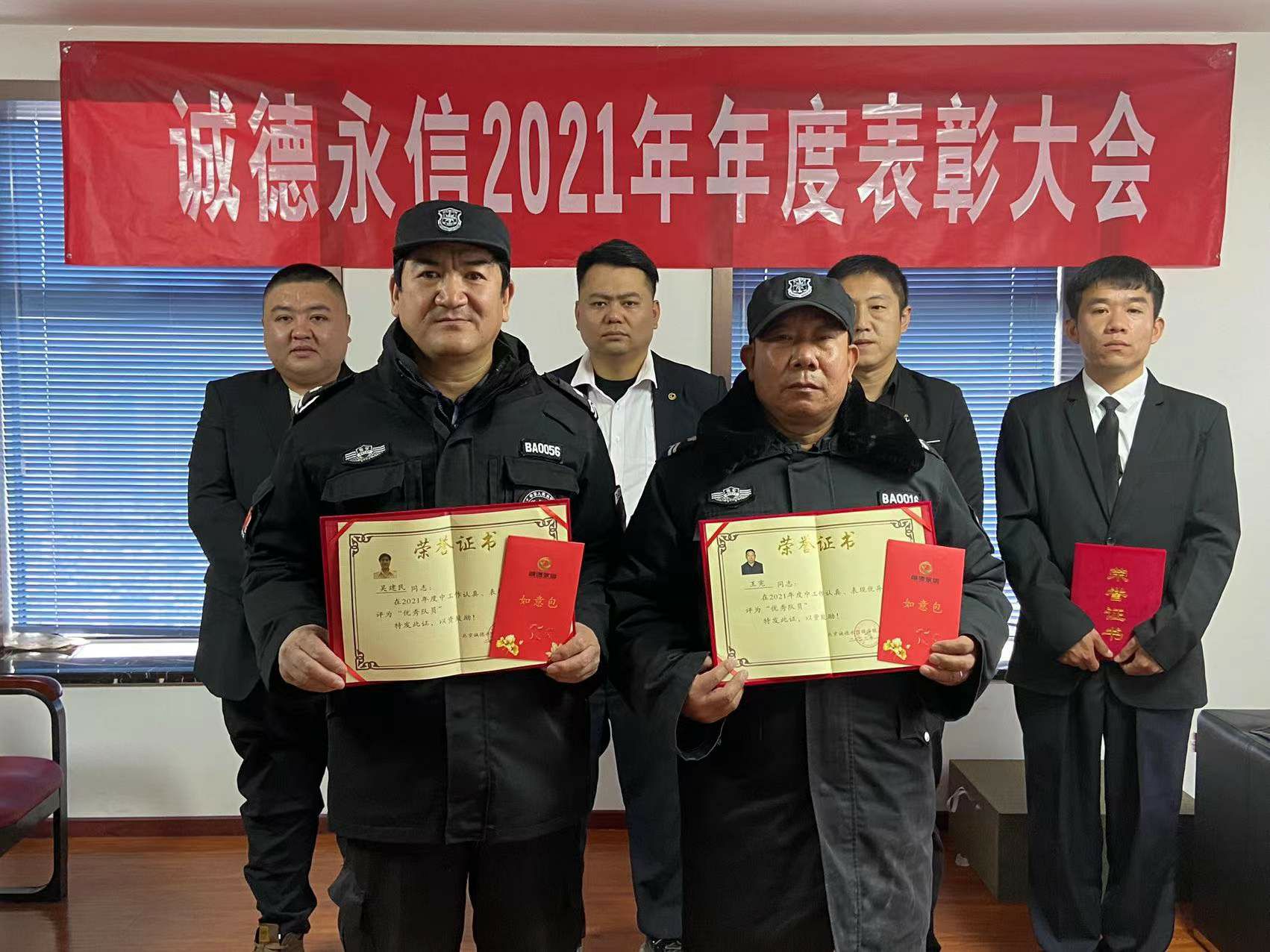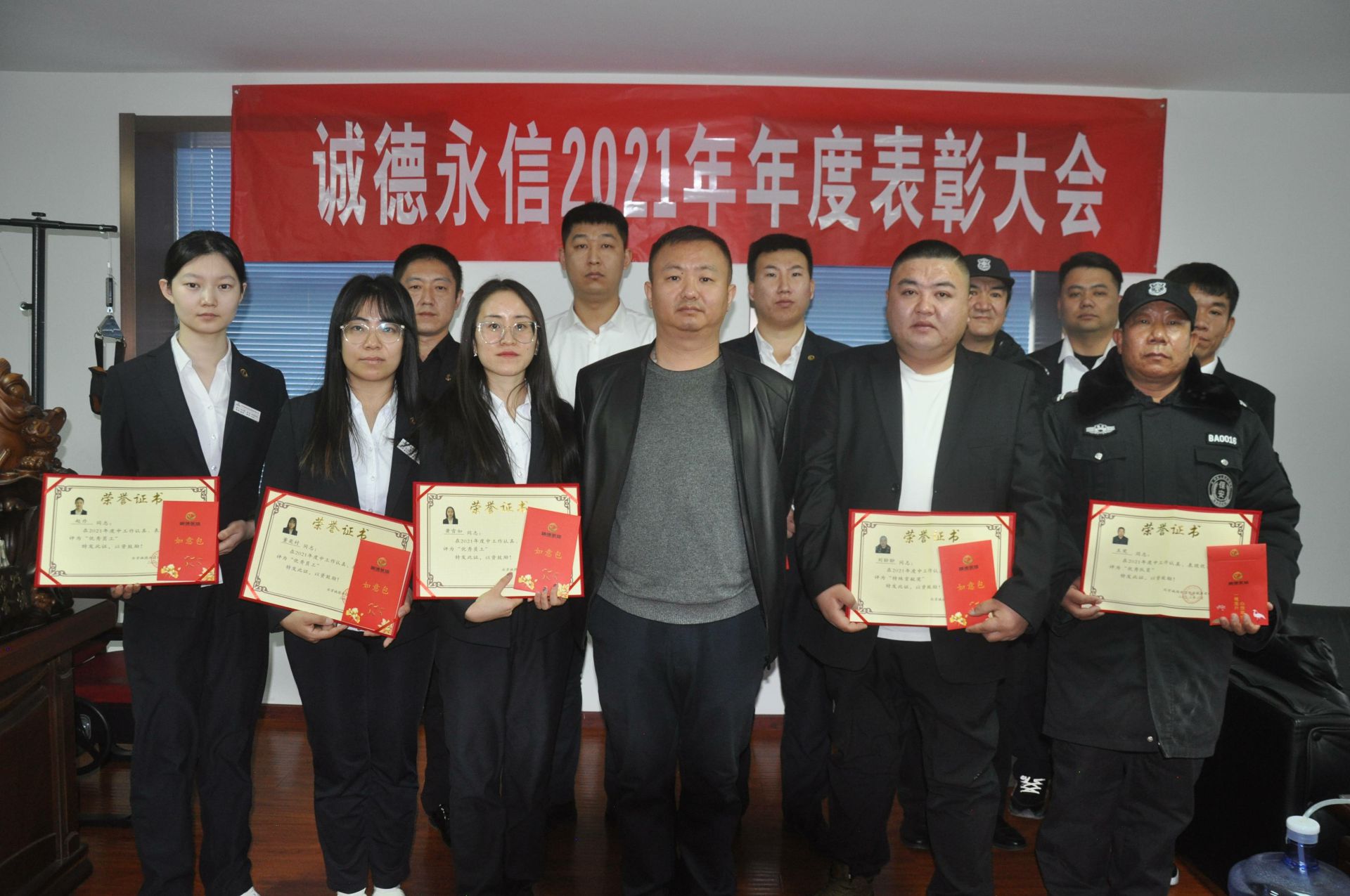 董事长特别提出对两位基层员工表彰,这两位队员认真工作、遵守各项规章制度,对人员、车辆和物品的进出管理做到了严格管控。在自己的岗位上恪尽职守,认真做好登记和交接记录。为人正直、以身作则,对工作有高度的责任感。这种尽职尽责、热情服务的工作态度不仅体现了一名保安员应该有的职业素养,还体现了为人民服务的精神,树立了公司保安的良好形象。董事长王永希望广大员工要以他们为榜样。也希望以上获得荣誉表彰的个人,珍惜荣誉,戒骄戒躁,在工作岗位上继续保持和发扬模范带头作用。